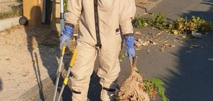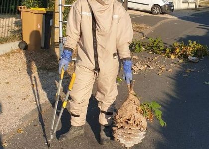 DESTRUCTION D’UN NID DE FRELONS ASIATIQUES DANS UN ARBRE SUR LA VOIE PUBLIQUE PROCHE DES